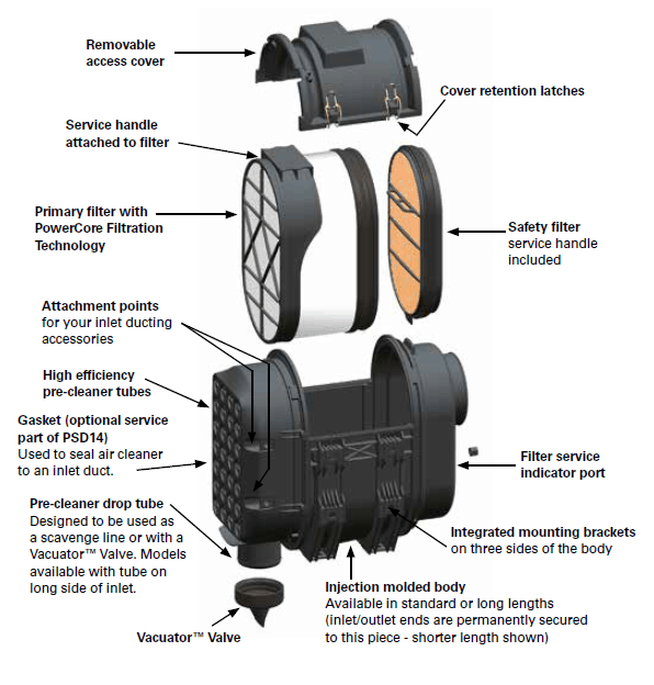 Air cleaners offer two-stage filtration in a single, compact unit that delivers superior filtration performance using PowerCore Filtration Technology. This non-metal air cleaner (except for cover clamps) is ideal for medium and heavy-duty equipment operating in severe dust environments.