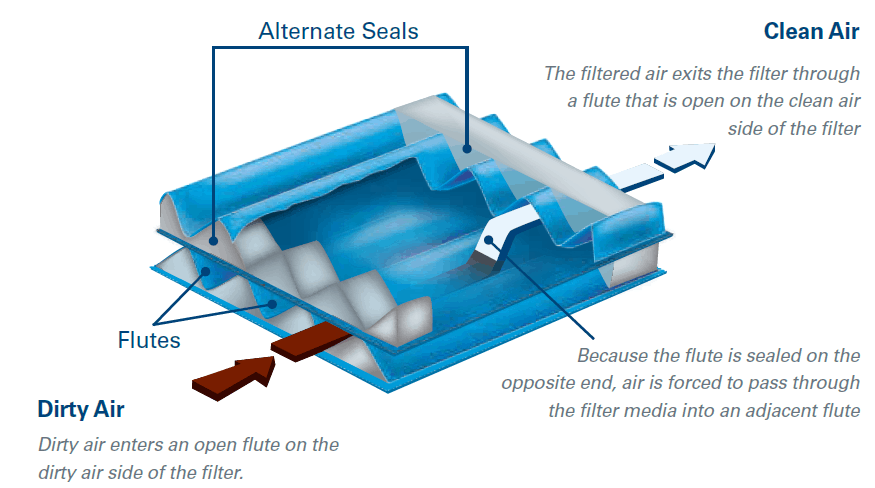Because the flute is sealed on the opposite end, air is forced to pass through the filter media into an adjacent fluteClean Air